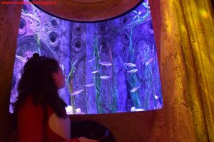 Abbiamo raggiunto la sala con le vasche dei Pesci Nemo, dove è stato ricreato un piccolo tunnel, davvero divertente per i bambini da passarci attraverso. Da qui si cambia ancora stanza passando attraverso un vero e proprio tunnel: ciò che si apre davanti agli occhi è qualcosa di unico. Squali, razze e pesci girano intorno a statue di varie grandezza che prendono ispirazione dagli abissi più profondi.