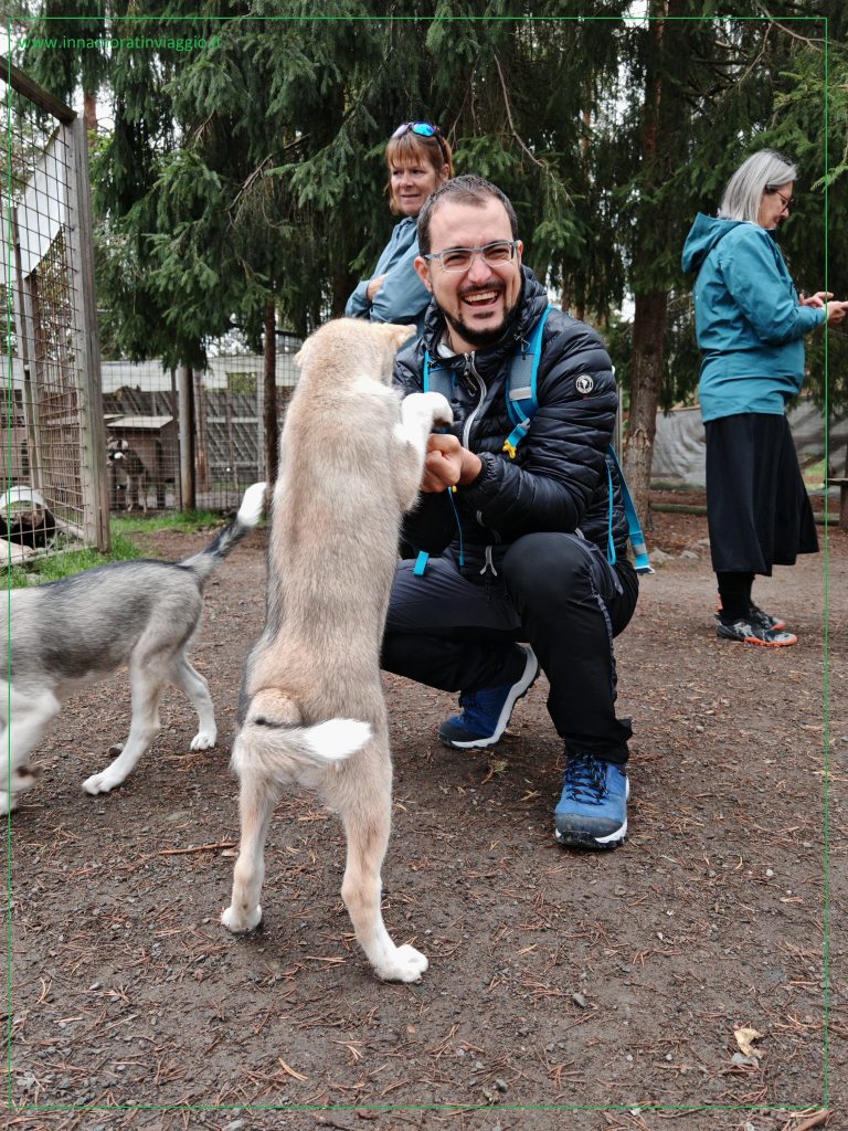 Dopo questa prima parte di presentazione, abbiamo avuto modo di avvicinarci ai recinti degli husky adulti: abbiamo avuto del tempo per coccolarli facendoli restare all’interno. Tutti hanno dimostrato un carattere molto docile, ci hanno riempito di zampate affettuose e leccate sulla faccia e si sono lasciati coccolare e accarezzare con molto piacere.